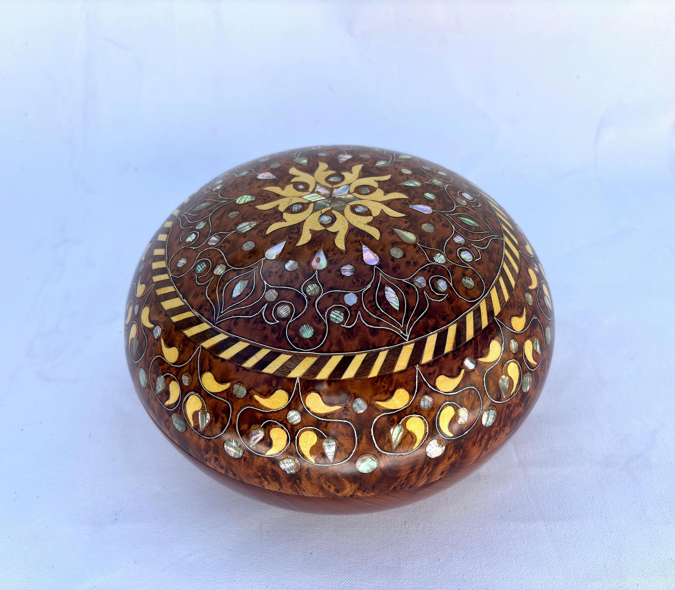 This handmade Thuya burl wooden pebble box is a true testament to Moroccan artistry and craftsmanship. Made from sustainably sourced Thuya wood, this round box is perfect for storing jewelry, trinkets, or small keepsakes. The natural wood grain and smooth finish highlight the beauty of the Thuya burl, making it a stunning decorative piece for any room. Its compact size and elegant design make it a versatile storage solution for your dressing table, desk, or nightstand. Whether you’re looking for a unique gift for a loved one or a special treat for yourself, this eco-friendly jewelry box is a timeless choice. Free shipping ensures it arrives safely at your doorstep!