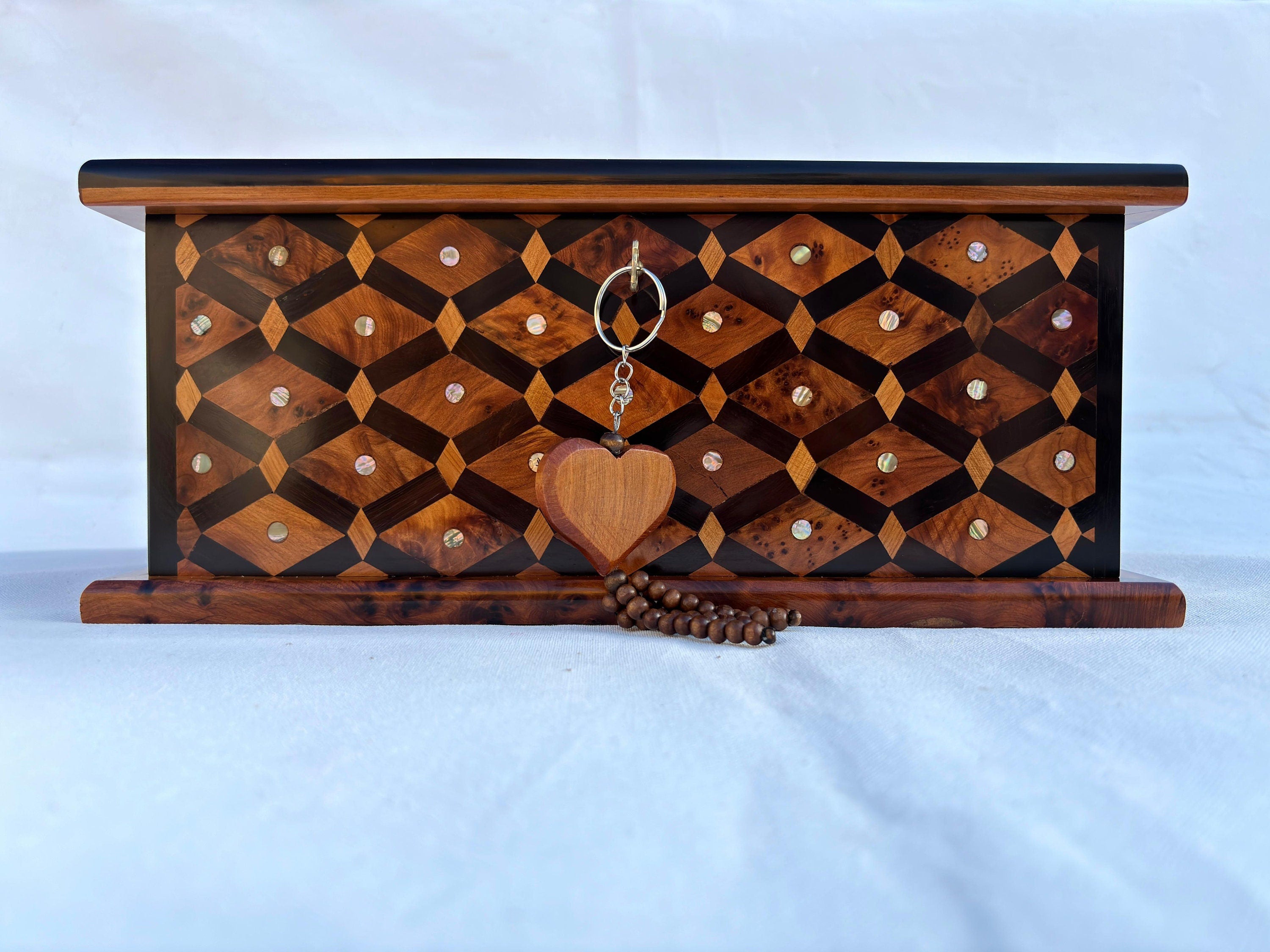 This handmade Moroccan Thuya wood jewelry box is a luxurious and functional storage solution for your jewelry and keepsakes. Crafted from rare Thuya burl wood, it features a natural, rich grain and a warm, aromatic scent that adds to its appeal. The lockable design ensures your valuables are secure, while the polished finish and intricate craftsmanship make it a beautiful decorative piece. Perfect as a wedding gift, anniversary keepsake, or a thoughtful present for someone special, this box is a timeless treasure. Each piece is handmade by skilled Moroccan artisans, making it a unique and meaningful addition to your home or a cherished gift for a loved one. Whether you’re looking for a stylish way to organize your jewelry or a unique gift, this Thuya wood box is the perfect choice.