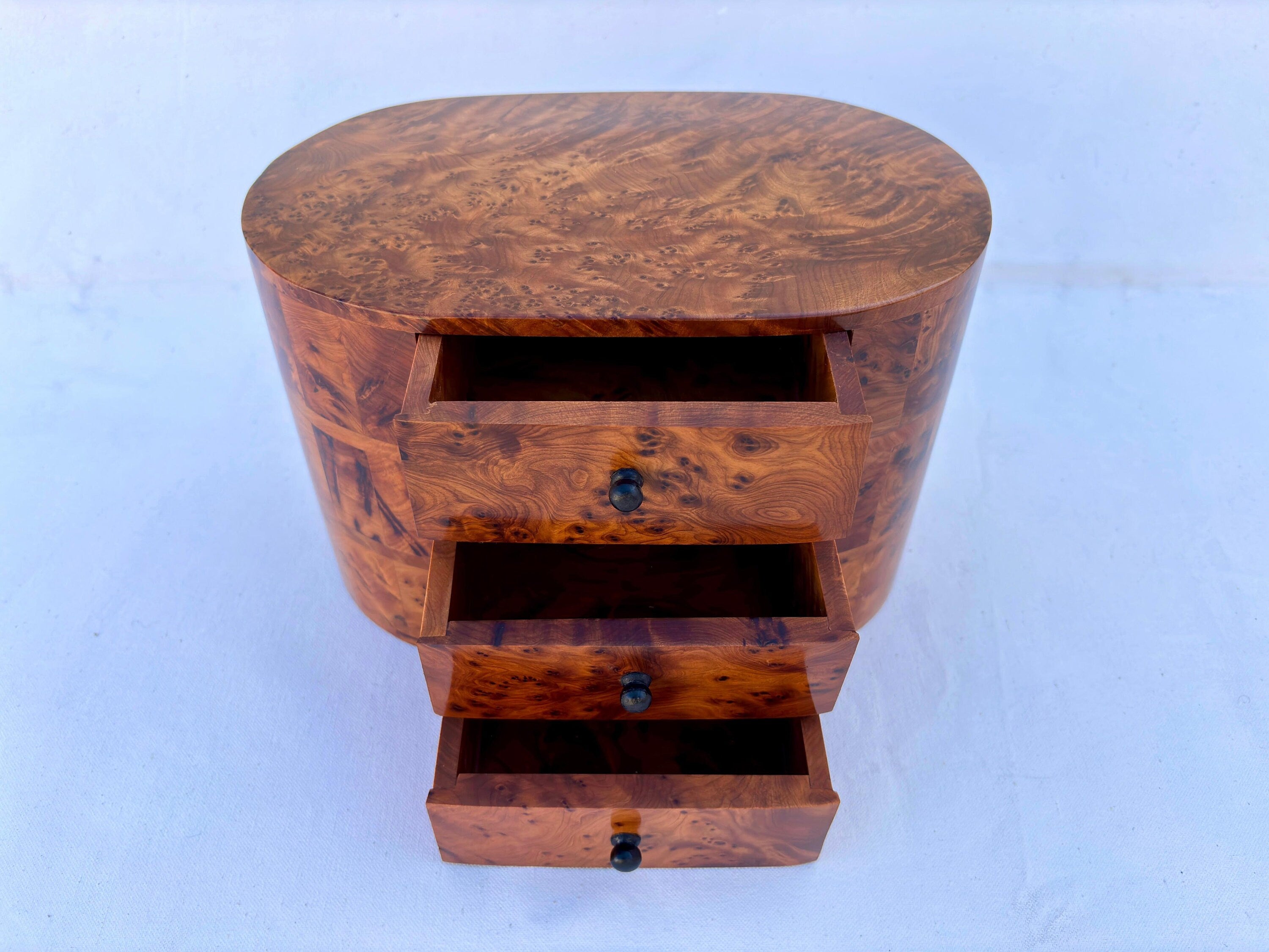 Elevate your jewelry storage with this handmade round wooden jewelry box, crafted from premium Thuya burl wood. Its unique circular design and smooth finish make it a standout piece for any dressing table. Perfect as a jewelry organizer, memory box, or decorative storage solution, this box is an ideal Christmas gift or holiday present for women who appreciate timeless elegance.