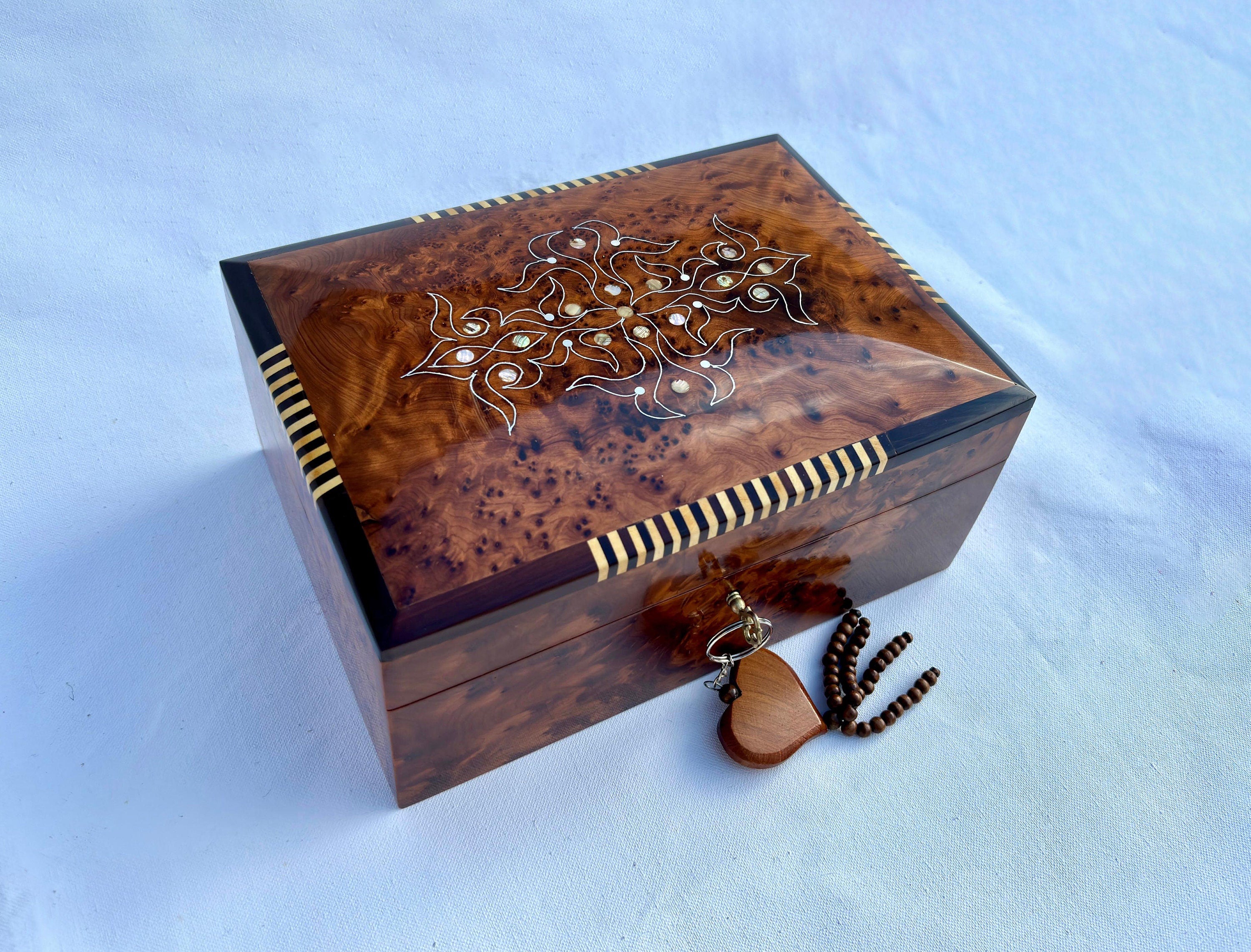 Handcrafted from Rare Thuya Wood: Each box is uniquely made from Thuya wood, celebrated for its distinctive grain patterns and rich, natural colors.