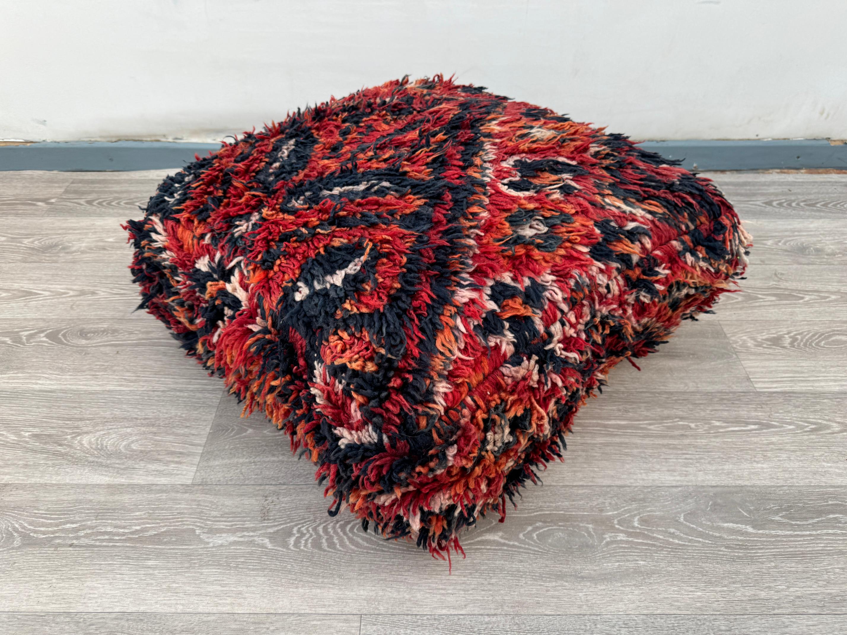 Add a touch of boho luxury to your home with this handmade Moroccan wool pouf and Kilim pillow cover. Made from 100% wool Kilim fabric, it’s durable, soft, and perfect for lounging, extra seating, or as a decorative accent. The vibrant colors and intricate patterns bring Moroccan charm to any space. Easy to maintain – spot clean or dry clean. Ideal for living rooms, patios, or reading nooks.